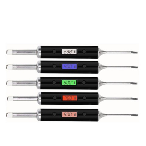 El medidor de temperatura eléctrico es el termómetro más pequeño del mundo (diámetro del tubo de 16,5 mm) calibrado específicamente para superficies de cuarzo, clavos de cerámica o clavos de titanio. La pantalla LCD mostrará la temperatura en tiempo real al contacto a una velocidad de 100 ms. La pantalla se iluminará en VERDE sugiriendo el momento ideal para aplicar extractos para obtener efectos óptimos. El medidor de temperatura eléctrico realmente proporciona la técnica más precisa (componentes de lectura de temperatura importados).